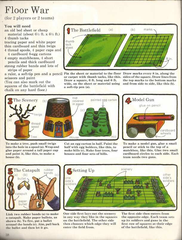 A sort of homemade miniatures game. Each player's units (infantry, cavalry, cannon) and the board terrain (hills, houses, trees) are made in a prescribed way from construction paper and household items including matchboxes, egg cartons, pencils etc. The game is played on a 6' square cloth divided into a 9×9 grid, with some squares occupied by terrain....