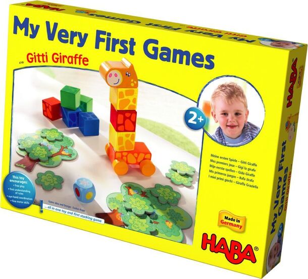 Gitti Giraffe – as with other titles in HABA's "My Very First Games" series – is a game for small children that's designed to teach them the concept of rules. In this case, players need to choose colors, stack blocks and carefully move a tipsy object across a table. The components of Gitti Giraffe are two trees, a color die, foliage cards, eight blocks and...