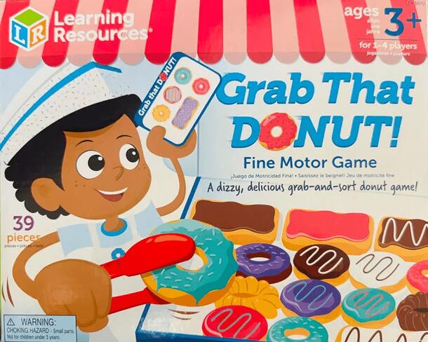 Serve up some yummy fine motor fun! Pile all the donuts onto the table, set out the spinner, and give each player a pair of tongs and an order card. Order up! - It's time to play! On each turn, players spin the spinner to choose a donut shape and color. Next, they have to find a donut that matches the spinner. Then, if that donut matches a donut on their...