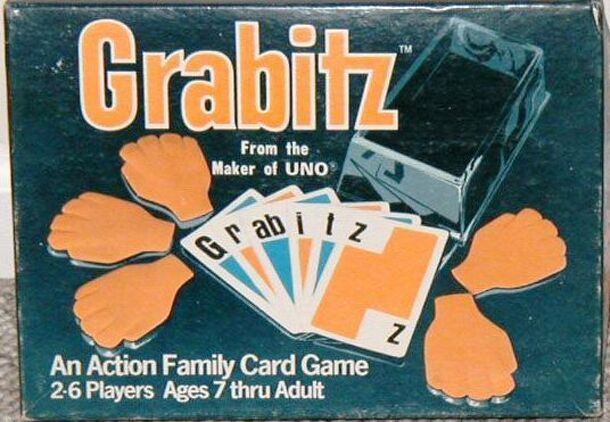 Grabitz is a commercial version of the traditional card game Spoons. Players collect cards trying to spell "Grab" using either cards all from one color or cards with only a single letter each but of any color. Once a player has accomplished this, they grab one of the hands in the middle of the table. Everyone else then grabs one too as quickly as possible....