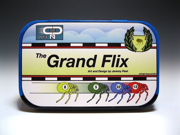 "Fleas from around the world have come to compete in a race of grueling speed and agility known as the Grand Flix. Only one champion will emerge from the ranks to become the most legendary flea of all time!" The Grand Flix is a dexterity racing game in which two to four players take turns launching, flicking, and spinning discs over the playing surface....