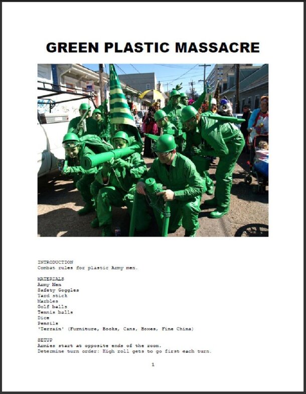 “Combat rules for plastic Army men." "Armies start at opposite ends of the room. Turn Sequence: Each figure gets to move once and attack once per turn. Mortars, machine guns & artillery can either move or attack during a turn.” Several different combat resolution mechanisms are included in the rules. The mechanism to be used depends on the nature of the...