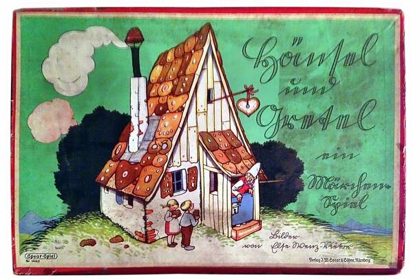 (translated: Hansel and Gretel - A Fairy Tale Game) Probably from the 1950s. A simple roll and move course with events from the Grimm fairy tale. The board has die-cut holes in it instead of spaces, it stays in place of the box. On the box's edge is a short wooden lever which can be used as a stand to keep the board at a slight angle. The playing pieces...