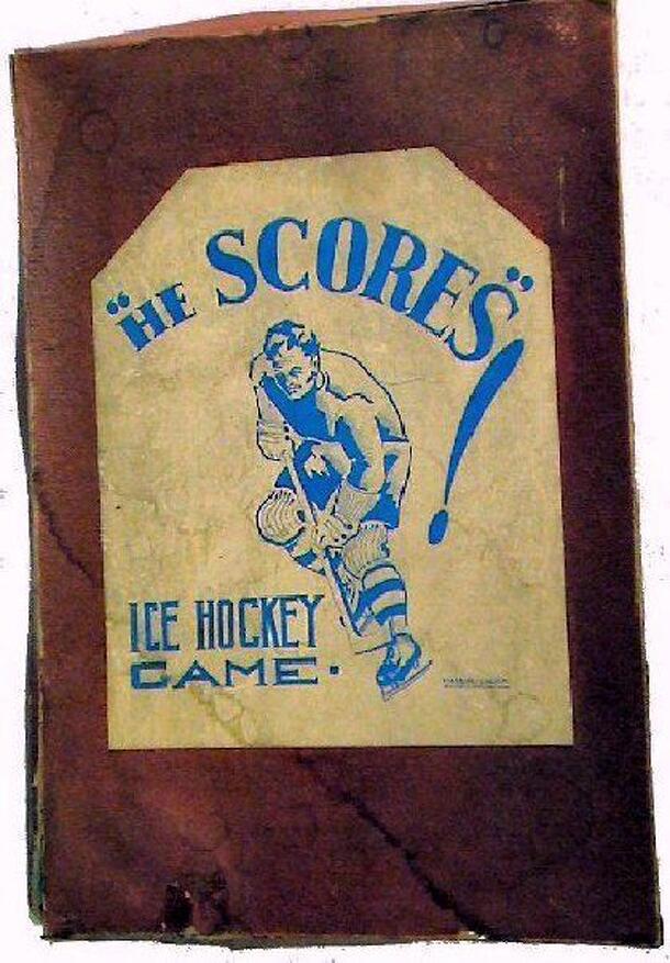 This game combines all the thrills of real hockey and is played on a board representing the ice surface. Players are shown in both Red and Blue. The game has two dice and a puck which is moved through squares in the direction and by the distance of what was rolled on the dice. Game appears to feature pictures of both the Montreal Canadians and the Toronto...