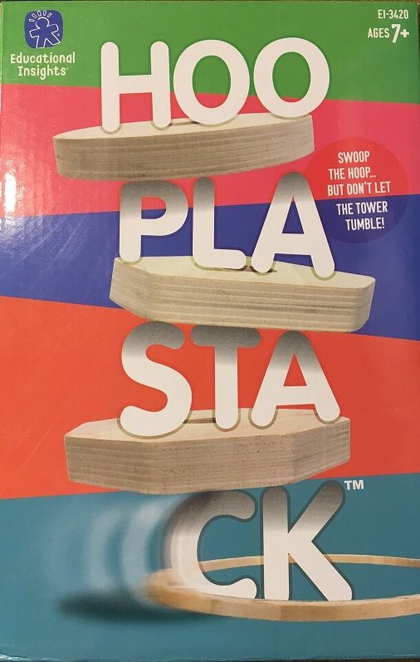Swoop the hoop... but don't let the tower tumble! Players stack a set of wooden shapes in a tower, lower a hoop down onto the table around the tower, then try to quickly "swoop the hoop" to pull out the lowest shape from the tower. If they succeed, they put the shape on top of the tower and pass the hoop to the next player. The player who knocks the tower...