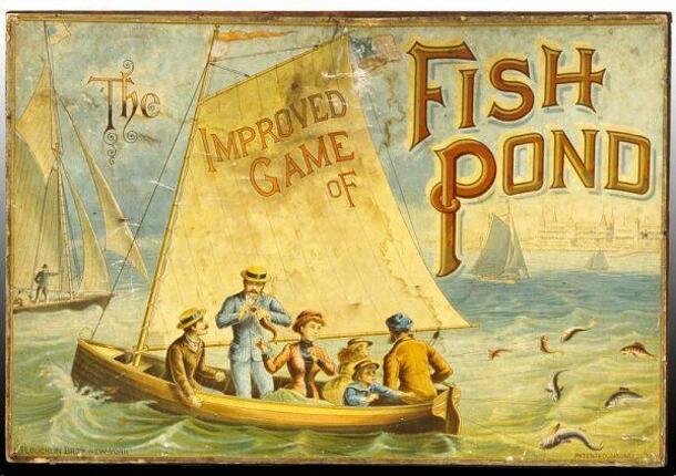 McLoughlin Brothers Improved Game of Fish Pond from 1890. The game has stacks of cardboard fish plus wood poles and metal hooks. Object of the game was to catch as many fish as possible. Each fish had as different value. One edition of the game came in a large wooden box measuring 18 1/2" x 12 1/2" x 3". Components included The Fish Pond (box insert with...