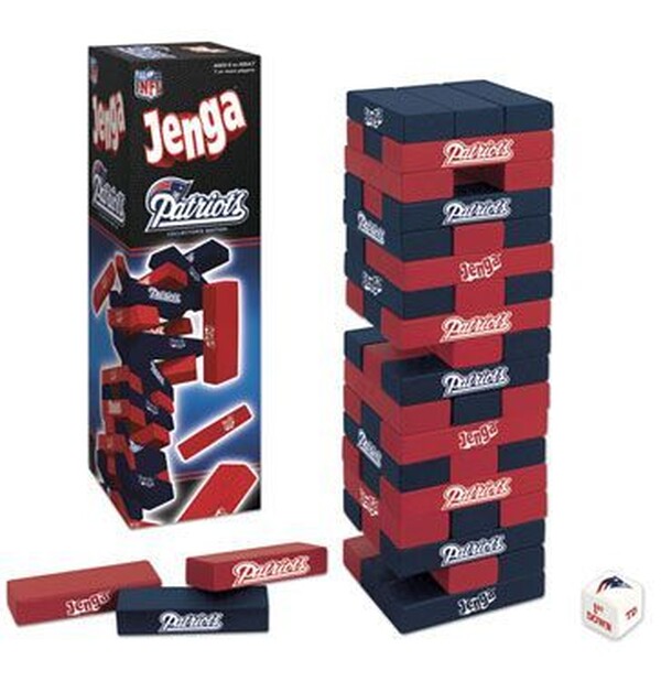 As the tower builds, so does the difficulty - and so does the fun! This classic tower building game features 54 red and blue hard wood blocks decked out with the Patriots logo and TWO ways to play. Build your Patriots-themed Jenga tower the traditional way or play a new and even more challenging game with custom Patriots rules and a Patriots-themed dice....