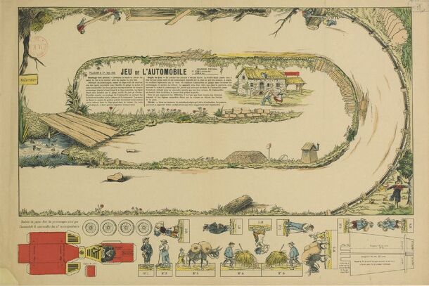 Jeu de l'Automobile is an antique and simple blast-racing game. After assembling the models, the paper sheet is placed flat on a table and the characters arranged on the track at the discretion of the players. By blowing lightly on the wing of the car the player has to drive the automobile to the garage, without overturning the figures and especially the...