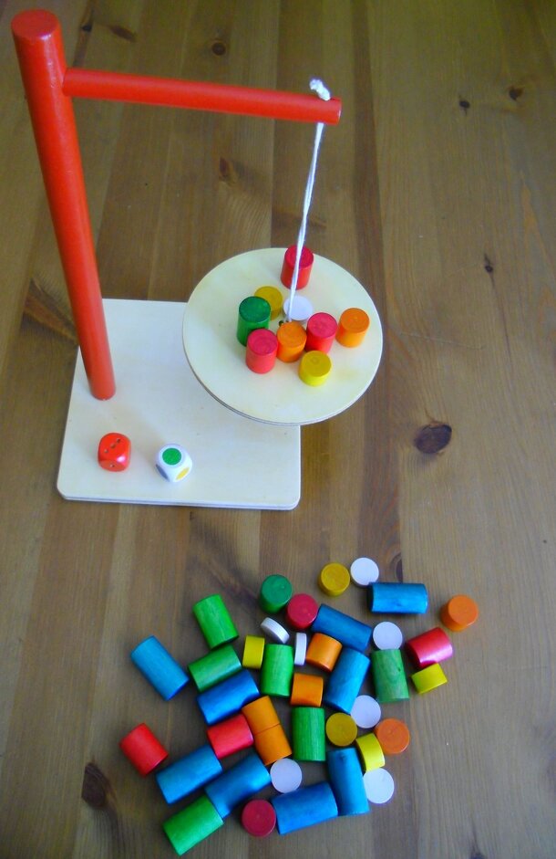 Kipp-Klapp is a nicely made balancing game made with quality wood construction. The game contains a base that holds up a simple from. Players suspend a round playing surface approximately 5 inches in diameter. Then players take turns placing the cylinders of different size and color on the circular surface trying to maintain balance. Players are not...