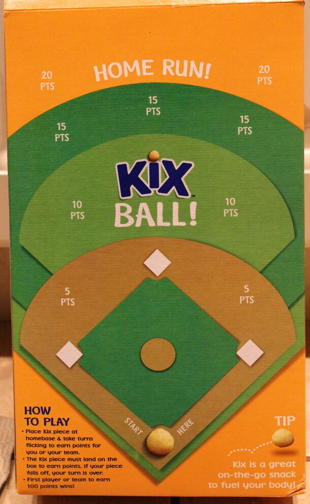 A dexterity game published on the back of Kix cereal boxes in 2022. Players flick pieces of cereal across the board and score based on where the piece lands on the baseball-themed board. First player to score 100 points wins. Going off the board scores 0, so there is risk in going for the higher point values. The irregularity of Kix cereal pieces also adds...