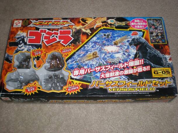 Game Contents: Customizable game board, 1 Bag of Bumpers, 1 Bag of plastic rivets to hold the bumpers in place, 4 Plastic Monster on a roller base - including Godzilla, Mechanized Godzilla, Mothra,& Three Headed Hydra, 2 Skyscrapers, 2 Train Cars, two shooters (one red and one blue) and the instructions - all in Japanese. The Board is set up in a maze...