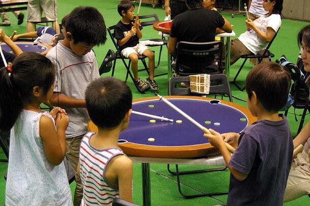 A table game with a circular board that has four pockets. The board is made of wood and has a circumference of 85 cm. It revolves like a lazy Susan so players need not stand up. The games have elements of Carrom and Billiards (The name is a contraction of 'mini-billiards'). Each player has a hand held spring-loaded cue with which they try to hit various...