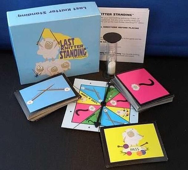 Last Knitter Standing is a game with trivia and challenge cards in order to find the best knitter. Game includes a spinner to select which type of cards to draw, a sand timer, and four different types of cards. Players must supply their own needles and yarn which serves as each player's scoreboard, as well as being used for certain types of challenges. The...