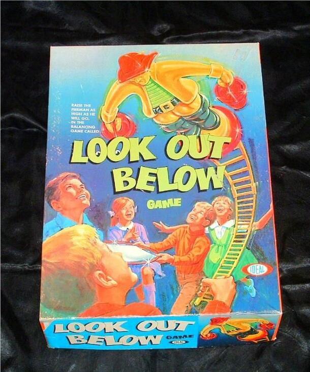 From the box: 'RAISE THE FIREMAN AS HIGH AS HE WILL GO IN THE BALANCING GAME CALLED ... LOOK OUT BELOW' 'Raise the fireman on his ladders - higher and higher and higher! Then, try to lower him down to earn points. But, if the ladders start swaying and the fireman falls ... you better LOOK OUT BELOW!' Box measures 13" x 17" x 4". The game consists of a...