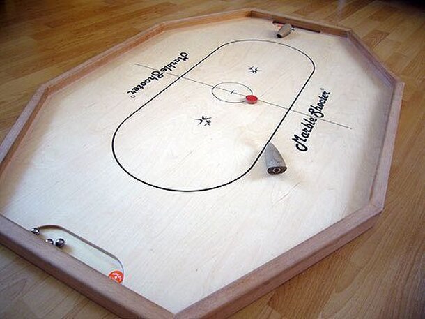 Dexterity game for two (or more) players. The board is a kind of "uneven hexagon", with goal zones at two ends. Each player holds a "shooter", a small wooden device that holds marbles with a magnet. The marbles can be shot out to hit a wooden disk - the goal of the game is to edge the disk into the opponent's goal zone. Play proceeds simultaneously, there...
