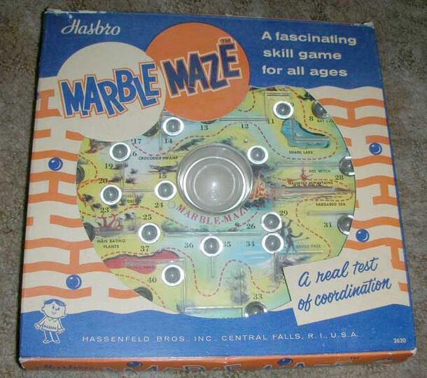 Box says; 'A fascinating skill game for all ages: A real test of coordination'. Each player tries to get the marble to the end of a long track without it falling into a hole. The first player to get the marble to the end, wins the game. If no-one accomplishes this, then the winner is the player who travelled furthest along the track. This plastic maze was...