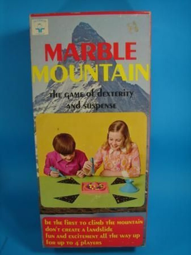 Marble Mountain is a children's dexterity game. Elements of the game are: A large number of marbles in solid colors including red, blue, yellow, green and purple. A yellow plastic "mountain" in a volcano shape with a small rim at the bottom to catch fallen marbles. A matching plastic cone that marbles are poured into and that the mountain is then fitted...