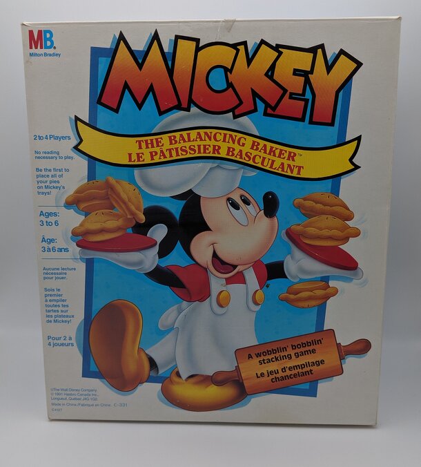 This game features a Mickey Mouse dressed like a baker. He stands on a wobbly base and holds an empty tray in each hand. All players take an equal number of pie pieces from the supply. On your turn, you place one of your pies on either of Mickey's trays. If you place it without having it, or any other pie already on the tray(s) fall off, your turn is over....