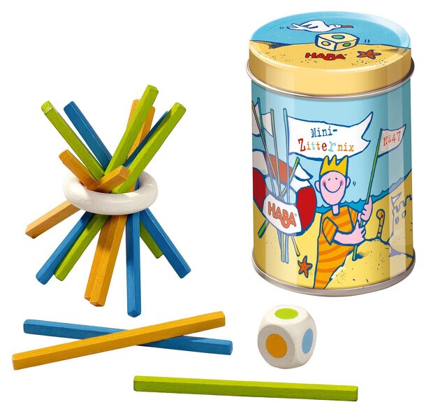 Wooden dowels of the same thickness are placed within a wooden ring and then twisted so they balance on the table. Players roll a colored die which determines which dowel they must remove from the ring (colors are green, orange, and blue). Each dowel is worth 1 point. The player with the most points when the structure collapses (when the ring hits the...
