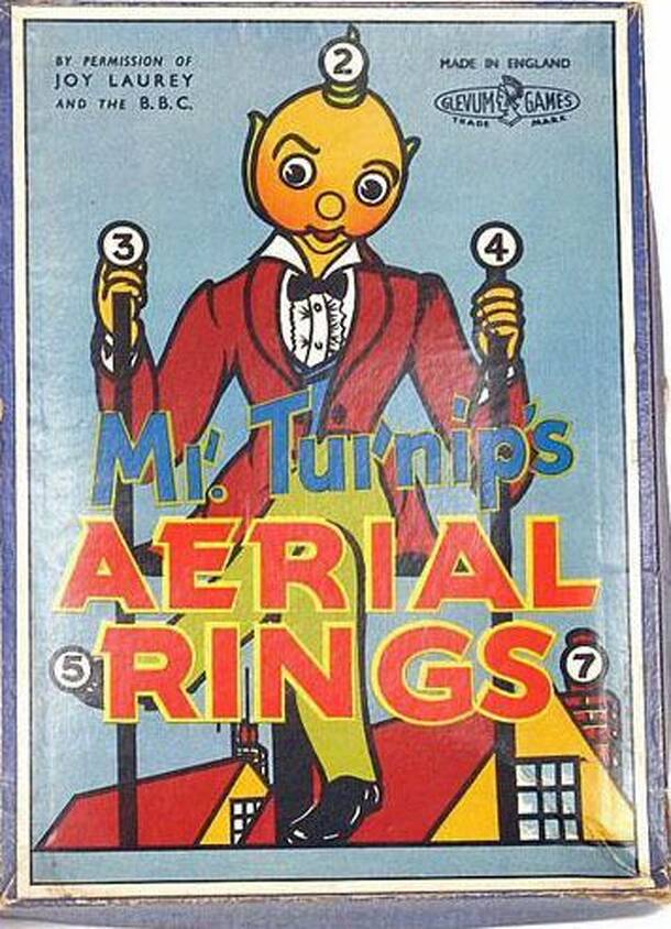Hoopla version, where you try to land your rings on parts od Mr. Turnip's body. On the board that the Mr. Turnip figure sits, there are also scoring areas, four with a positive score, two with a negative score. Mr. Turnip was created by puppeteer Joy Laurey (credited in the top left corner of the box lid), for the children's programme, Whirligig. The show...