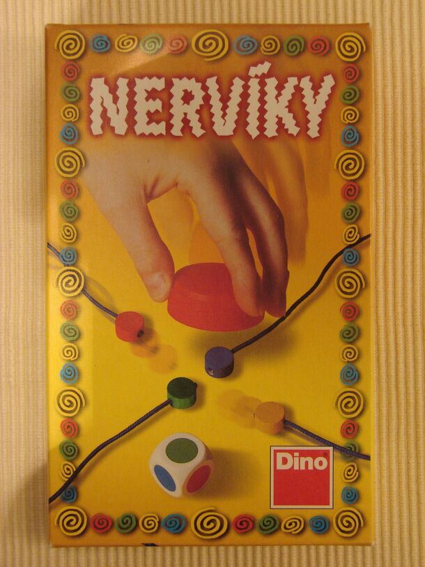 A dexterity game. NOTE: Nervíky (Czech/Slovak) = nerves (to be more precise: little nerves). Set-up: One player (the catcher) has a small cup, and a die with different colours on its faces. The other players each have a differently-coloured wooden piece (yellow, red, green, or blue) with a string attached to it. Aim of the game: Players try to receive the...