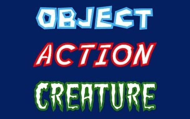 In this game teams compete to collect one card from each of three categories (Object, Action, and Creature). Each member of a team brings 5 items (together the items must all fit in the palms of the hands of the person who brought the items) and those items are then used as props for that team. On a turn a member of a team rolls the die, draws a card, and...