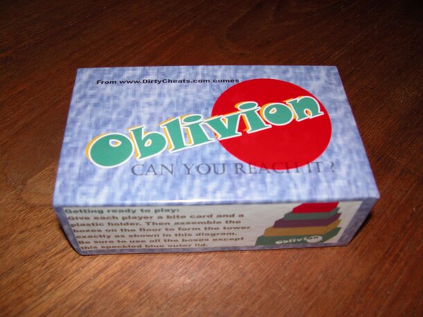 The game consists of 5 boxes, of decreasing sizes, plus card holders for each player and a bunch of 'bite cards" - thin strips of card which fit into the card holders. The boxes are stacked on the floor, largest first, in order of size. On your turn you place your bite card in its holder on top of the pile of boxes. Then you try to pick your card up with...