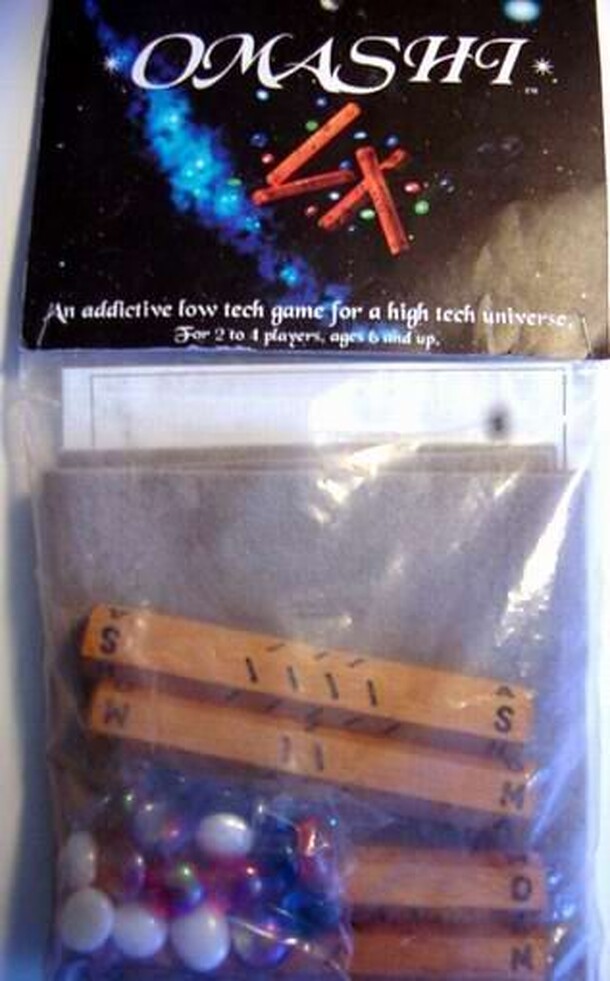 From the game package: Omashi is the fun new game of sticks and stones that can be played many ways almost anywhere. It's easy to learn and will provide many hours of enjoyment for your family and friends Omashi is also a game that allows you to use your own imagination to create whole new ways to play it! So if you think about it, when you have the game...