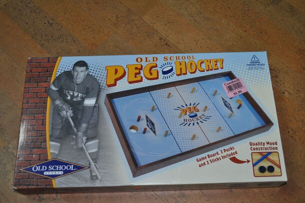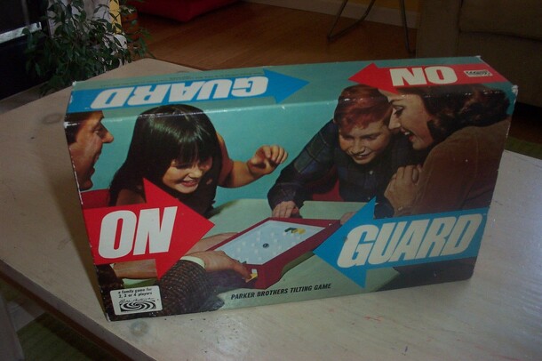 On Guard is a simple dexterity game made by Parker Brothers in 1967. It can be played by two players, or 4 with players working in teams with the goal of being the first player or team to score 5 points. The game table is a fairly heavy plastic construct, with large springs mounted beneath each of the rectangular board's 4 corners. Players depress the...