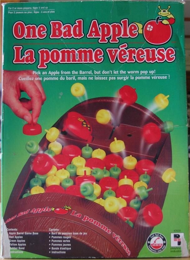 In this children's dexterity game, you must pick an apple from the barrel on your turn. You can either try for the big red one that's worth the most points, or try a smaller one that may be easier to pick. Reach for the stem and lift the apple up, but be careful! If you pick it without disturbing any other apples, you get to keep it and score points. But...
