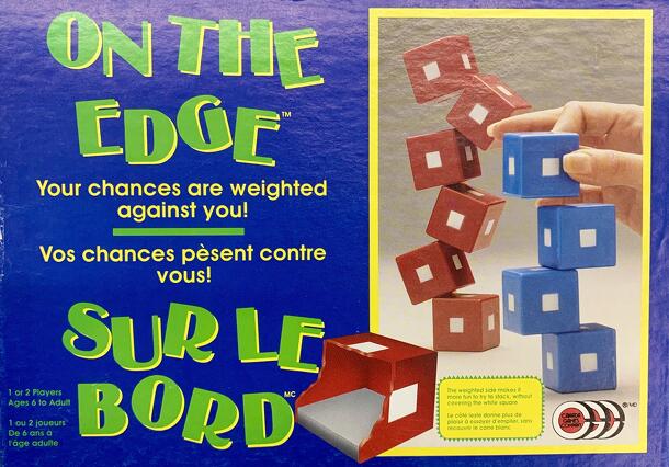 On The Edge is an abstract block-stacking game for two players: From the Rules: Be the first person to stack your cubes on their edge making sure not cover any white square in the center of each cube. Play of the game: Each player takes 8 of the same coloured cubes. Each cube has a weight on one side, so that when stacking players will need to put the side...