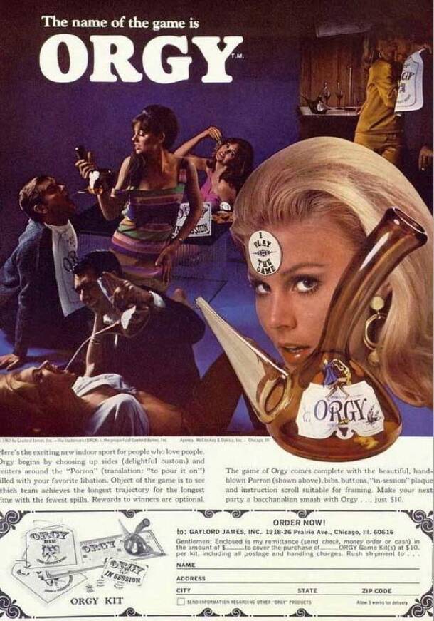 From the publishers ad: Here's the exciting new indoor sport for people who love people. Orgy begins by choosing up sides (delightful custom) and centers around the "Porron" (translation: to pour it on) filled with your favorite libation. Object of the game is to see which team achieves the longest trajectory for the longest time with the fewest spills....