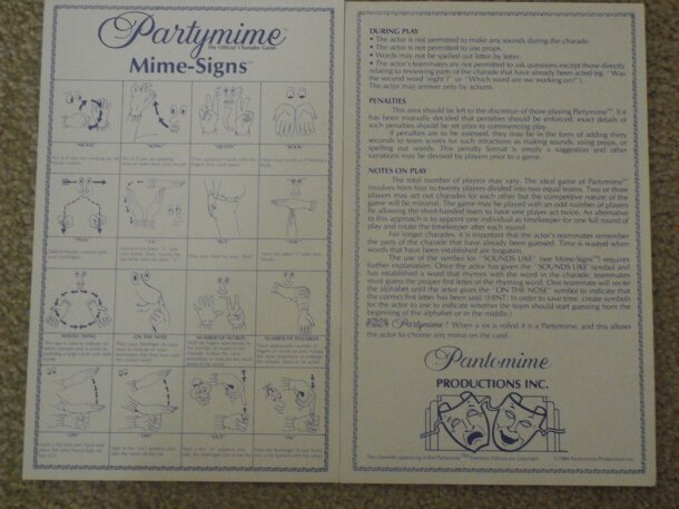 This is basically a board game version of Charades, but it does outlaw spelling out words. You break into two teams, and use basic charades style play to act out the card clues. The time or round limit is set for the game by consensus. There's an electronic timer, and a briefing on basic mime signs. There's an electronic timer, and a die, along with the...