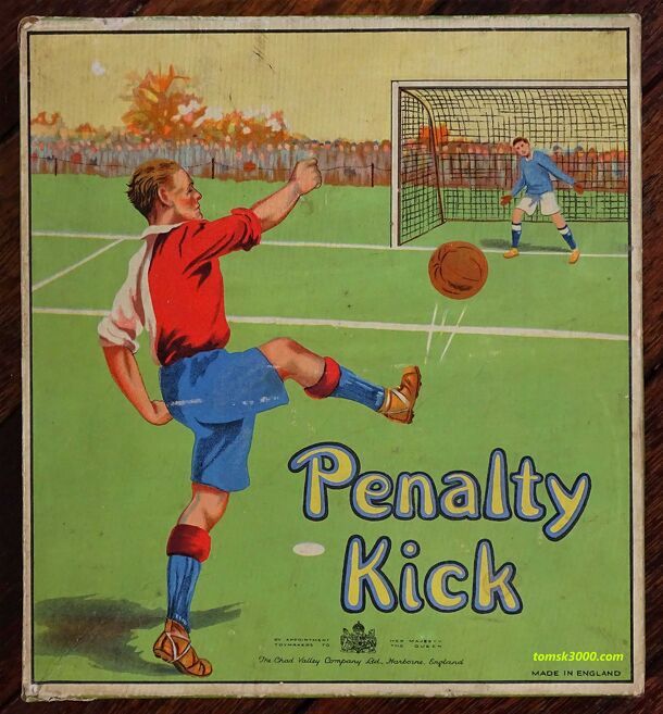 An early British two-player action game, simulating Association Football (Soccer) Penalty Kicks. The game consists of two opposing plywood figures: the penalty taker and a goalkeeper in a wooden goal frame. The object is to score most goals by shooting the ball into the goal using the Striker's spring-loaded leg. The goalkeeper attempts to save the shot by...