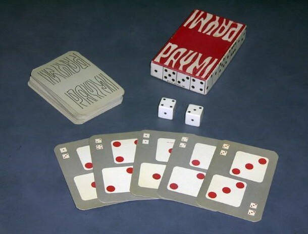 Paymi consist of two standard 6 sided dice and a deck of 42 cards with the picture of two rolled dice on each card. The cards are the 36 combinations you can get from rolling two dice plus six extra cards with the doubles on them. Each player start with five cards in their hand. The dice are rolled and the first player to call out "Paymi" and place down a...