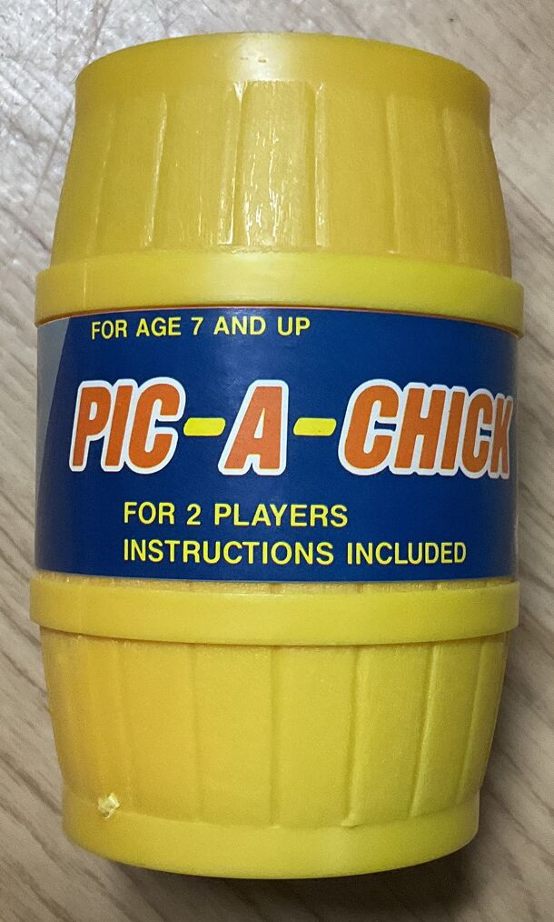 Pic-A-Chick is a race dexterity game using pieces shaped like cooked chickens. Both players place their chopsticks in front of them and the pile of chickens midway between them on player then rolls a die, at which point both players can grab their chopsticks and try to retrieve that many chickens. The first player to accomplish this task wins as many...