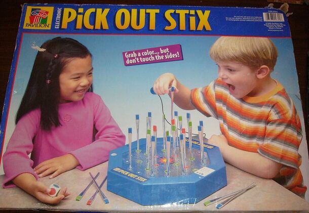 "Grab a color...but don't touch the sides!" This is a simple electronic dexterity game for all ages. Twenty-eight plastic, chrome-plated rods are placed in holes through a conductive play field. The holes are about a quarter-inch wider than the diameter of the rods, and there are holes under the holes to keep the rods centered and vertical. A handle with...