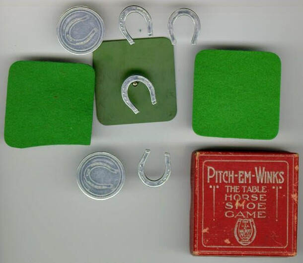 From game box inside: 4398 THE THREE GAMES OF PITCH-A-RING CROWN THE KING AND RING TOSS These games may be played by two, three of four persons. Directions For Playing Pitch-A-Ring Remove from the box, and inset the tall post in center socket (wooden post 9" long) of wooden frame (two wooden interlocking pieces 11" long). The player takes his position at...