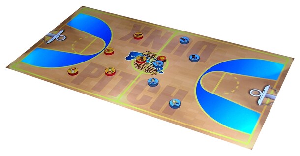 Pitch'n Dunk uses the mechanisms of disc-flicking to simulate a basketball game with the game board representing a basketball field with two 2-point zones and two 3-point zones. Each coach (player of the game) directs wooden tokens; each wooden token represents a player (with five on each team) or the ball. Coaches alternatively give their players a flick...