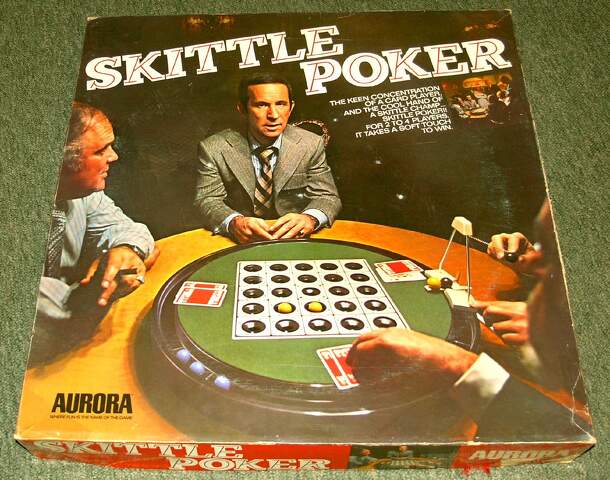 Skittle Poker by Aurora! Players make their poker hands by rolling balls into pockets that are marked as cards and combining them with their hole cards, which were dealt first. Don Adams promoted the Skittles product line and appears on the box cover photo. Game components: * Skittle Poker Playing Base. * Wire A-Frame * Slide * "Magi-Cue" Assembly *...