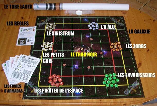 Glonk Le Choc des Aliens is a small print (150 for the moment) game, self-published by a French designer. Rules are in French. The game use the mechanics of the finger pitch to simulate a galactic war, each wood circular pawns representing a flying saucer. The mechanism of controlled pitch is the same developed in Pitch Bowl. Each player control an armada...