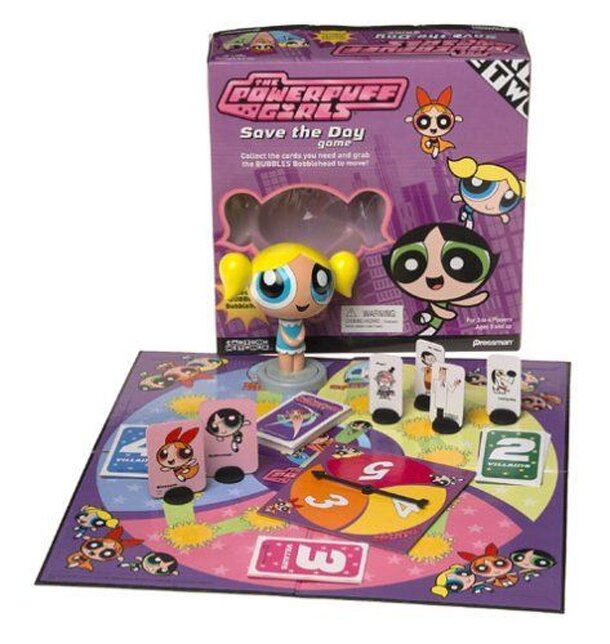 Features the "PowerPuff flying pole". Attached to the pole by a string is a plastic model of all three PowerPuff Girls flying together. When you reach certain areas on the board, you place the pole there, holding it with one hand and the plastic PowerPuff model with the other. The goal is to make the model "fly" around the pole by swinging it, to knock...
