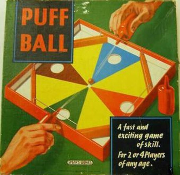 Spears action game. THe board has 8 sections, with a goal at the appropriate at every alternate side. If two play, opposite sections are played. If four play, then all goal-sections are used. Each player has a 'puffer', a miniature bellows that, when pressed, ejects a stream of air. The object is to 'blow' the ball around the board, trying to get it into...