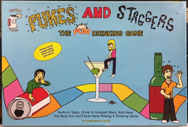 This is a basic roll-and-move game -- similar to Snakes and Ladders -- where the goal is simply to be the first to reach the finish space. The game board consists of a series of spaces, each requiring the player to perform some drinking-related task. "Staggers" allow the player to skip spaces ahead (like the Ladders) and "Pukes" cause the player to lose...