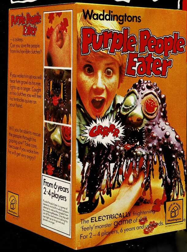 The ELECTRICALLY frightening 'feely' monster game of skill. For 2-4 players, 6 years and upwards. Purple People Eater - is asleep. Can you save the people from his horrible clutches? If you wake him up you will hear him growl as his eye lights up in anger. Caught in his clutches you will feel his tentacles quiver on your hand. Will you be able to rescue...