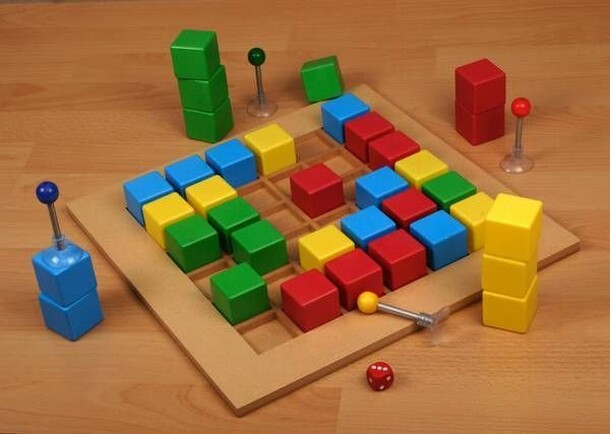 Quadro is a tower-building game played with 45 plastic blocks in three different colors and dice with colored circles that match the colors of the blocks. The blocks are stacked in a tower formation. Each story consists of three blocks of different colors placed adjacent to each other along its long side, and each story is placed perpendicular to the...