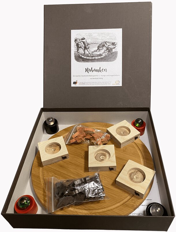 In Rabauken ("Bullies"), you need to keep things moving because if your ball stops, everyone else gets rewarded. To set up, place the round wooden board on the table. Each player receives a flat block of wood, a wooden tower with a bowl carved in the top of it, and a glass ball. Each player in turn places their block on the board, with their tower fitting...