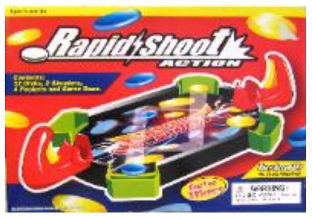 Rapid Fire! is a two-player shooting-gallery game in which the object is to knock down targets of the other player's color. The targets - alternating in red and yellow - rotate on a circular, battery-powered central wheel. Rotating in the opposite direction are blocking pegs, which protect the targets. For younger players, the blocking pegs may be removed....