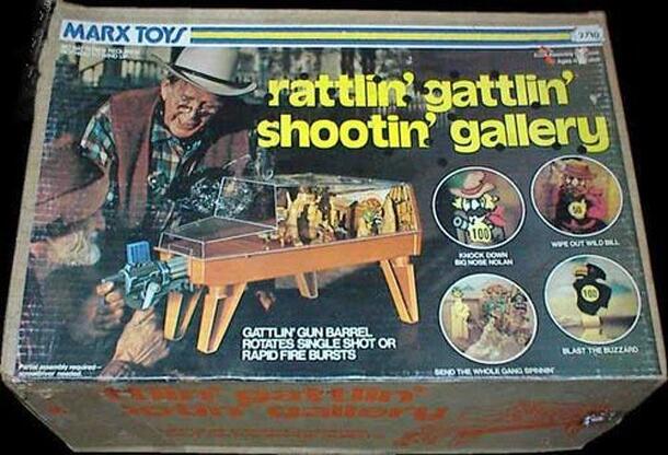 A Western-themed shooting/target game. The gun barrel turns like a real Gattling gun and shoots ball bearings just as fast as you can turn the handle. It is also the most painfully loud thing I have ever heard and I can only let my son play with it for a few minutes at a time lest my head explodes like the guy in the movie Scanners. Each turn a player can...