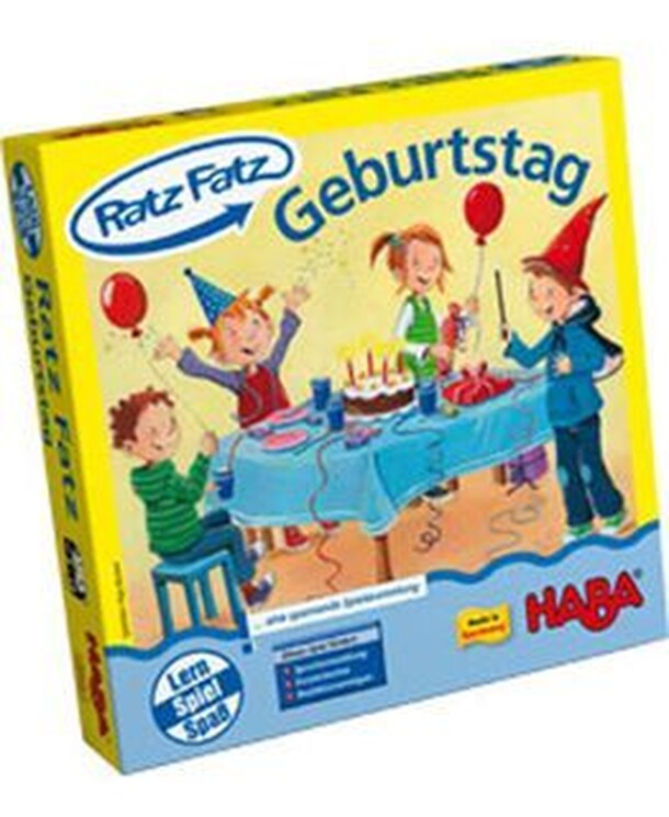 A birthday-themed educational children's game in the Ratz Fatz series. The game consists of 20 wooden figures (a rabbit, a pirate, a candle, a cake, a present,...), 10 wooden tokens and a booklet with several game ideas for kids of various ages. The basic game idea is that an adult reads or tells a story or a poem from the booklet, and the children have to...